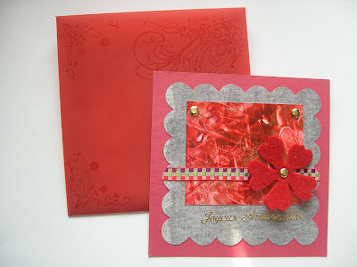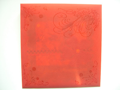 Comme je n'avais pas d'enveloppe assortie, j'ai décidé d'en réaliser une tout de suite... Oui, parce que si je prévois de la faire plus tard, j'oublie (NdlR : Merci Aloys) ou je n'ai plus le temps... J'ai eu envie de la réaliser "transparente"... et j'ai trouvé un feuillet de calque rouge qui m'avait l'air d'une compagnie tout à fait respectable pour ma carte... Quelques arabesques plus tard....