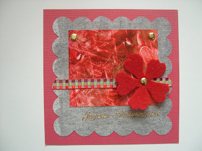 Donc j'ai essayé cette petite carte-là : à dire vrai, j'aimais moyennement le côté droit de la carte alors que les trois autres côtés étaient biscuités... mais bien sûr, réaliser une carte pliée et quatre côtés biscuités tiens de la gageure... alors j'ai préféré une carte à une seule page... J'ai juste remplacé l'illustration par une fleur et utilisé un des fonds que nous avons réalisés à la peinture encaustique lors de notre dernière journée "Patouillages"...