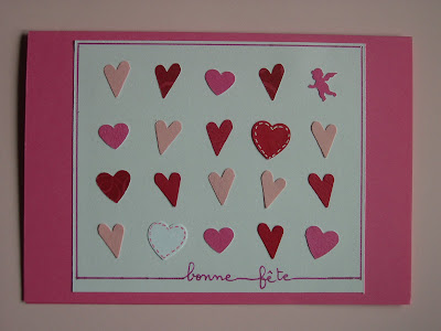 Et voici le modèle plébiscité par la jeune classe (modèle choisi par 20 enfants sur 48*), modèle simple s'il en est, je n'avais pas caché l'adhésif sur l'arrière pour qu'ils comprennent le principe, la difficulté résidant dans la découpe du coeur... Je n'ai pas pu leur faire utiliser la perforatrice car le coeur aurait été à 1 cm du bas de la page... Cela eut manqué de cachet, n'est-il pas ? Mais certains ont chouettement dessiné leurs arabesques...