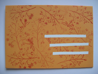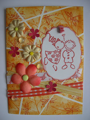 Puis j'ai appliqué l'encre distress orange avec un applicateur mousse, les tampons décoratifs "fougère" et "libellule" en imprimant plusieurs fois sans encrer à nouveau de manière à avoir plusieurs nuances de l'encre distress rouge "feu". J'ai ensuite ôté mes rubans et continué la carte en collant les papiers-rubans assortis (Ca peut compter pour l'option "trois papiers coordonnés" ?), des fleurettes, tissu et papiers, quelques demi-boules de plastique transparent, un tampon décoratif "bisou" sur une étiquette ovale dont les contours ont été également encrés.